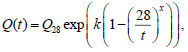 where t is the time in days, Q28 is the amount of heat released during the first 28 days of hardening, MJ/m3, and the coefficients k and x depend on the rate of hardening of the concrete.