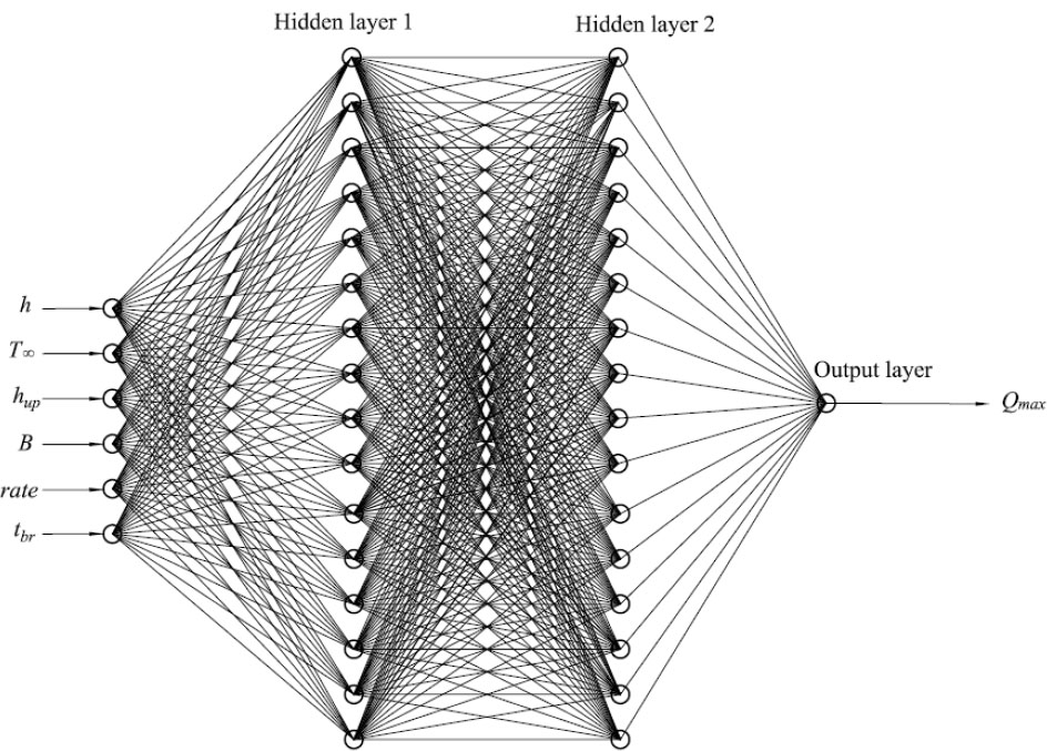 The architecture of the neural network used is shown in Fig. (2). The neural network includes 2 hidden layers with 16 neurons each. The dependence of Qmax on the input parameters is not a simple linear or quadratic function. It involves complex thermomechanical relationships described by a system of differential equations. A single hidden layer can, in theory, approximate any continuous function (Tsybenko's theorem), but in practice, complex dependencies may require an exponentially large number of neurons. Two hidden layers allow the network to construct a more hierarchical and efficient internal representation of the data. The first hidden layer can extract primary, relatively simple nonlinear combinations of input parameters (e.g., the interaction between h and hup). The second hidden layer can combine the primary features from the first layer to form more abstract, complex representations necessary for accurate Qmax prediction. A two-layer architecture is a compromise between accuracy and computational complexity. It has significantly greater capacity (approximation ability) than a single-layer network, but remains less complex and more resistant to overfitting than a deep network with three or more layers, which is excessive for six input parameters and the smooth nature of the data.