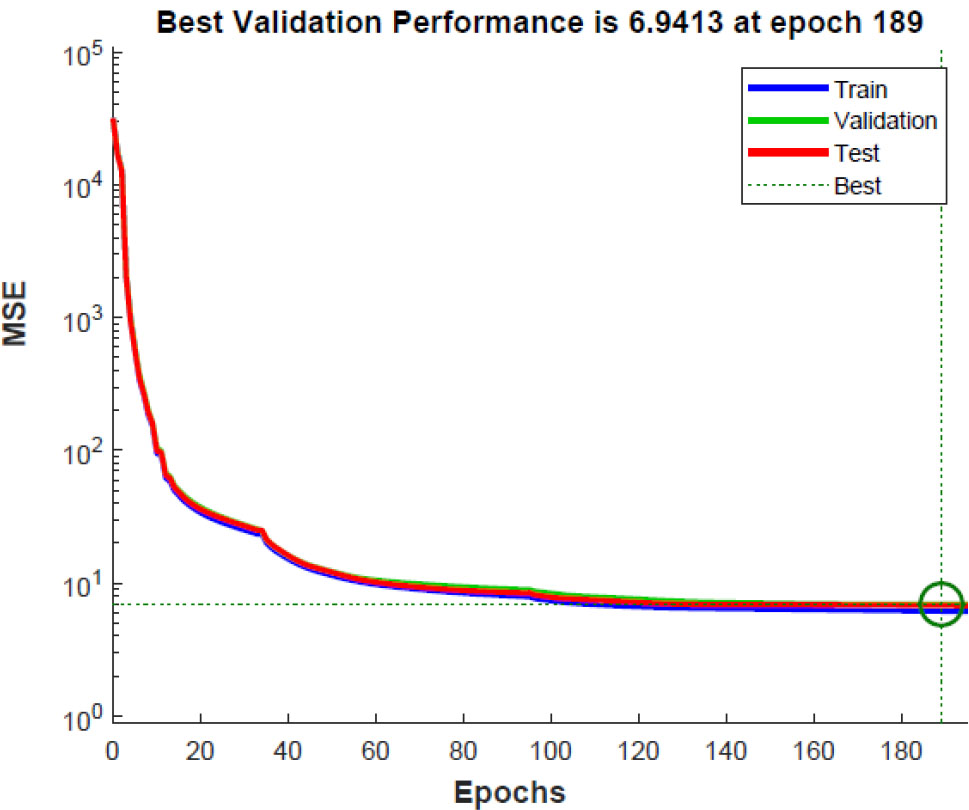 TANSIG (hyperbolic tangent) was used as the activation function for neurons. This choice is motivated by its nonlinear, smooth (differentiable), and symmetric nature, yielding values the range (-1, 1). These properties make it particularly suitable for regression problems. The procedure for forming the training dataset and the machine learning model was implemented in MATLAB. For training, the dataset was divided into 3 parts “Train”, ”Validation” and “Test”. The sample size of “Train” was 27440 rows. The sample sizes for “Validation” and “Test” were 5880 rows each. Data normalization was performed before training. Since the synthetic data are highly smooth, smoothing was not required. The Mean Square Error (MSE) was used as a training quality metric. The model was trained using the Levenberg-Marquardt algorithm [32, 33]. The choice of this algorithm was driven by a systematic approach that took into account the size and nature of the data (moderate volume, smoothness), the size of the network (small), and the priority of achieving maximum prediction accuracy.