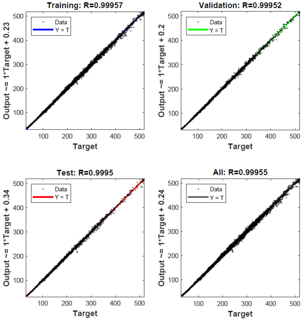 Regression plots for the “Train”, “Validation”, “Test” samples, and the entire dataset (“All”) are presented in Fig. (4). The target values T are plotted on the abscissa axis. The predicted values of permissible heat release, Y, are plotted on the ordinate axis. The correlation coefficient RYT between the target and predicted values for the entire dataset is 0.99955.