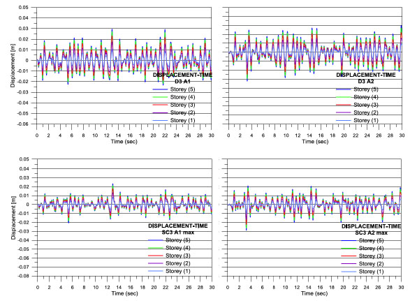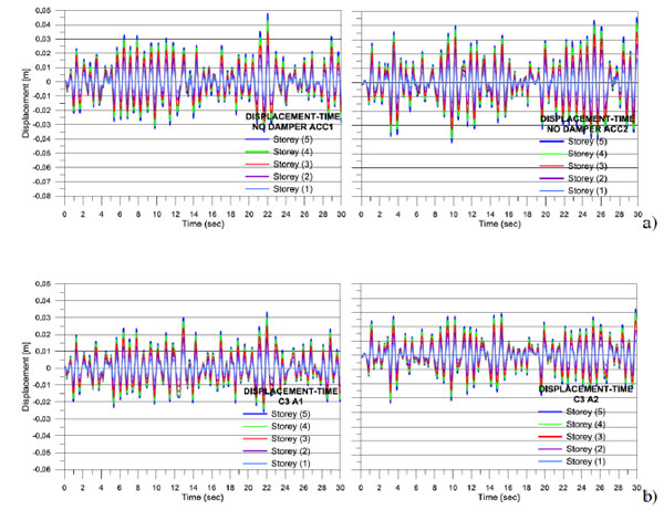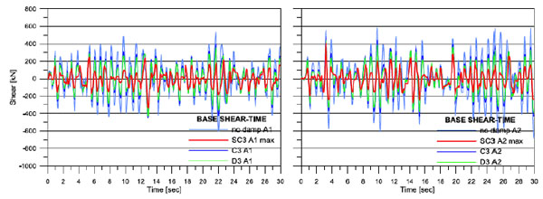 In Fig. (10) the time histories of the displacements at each storey are shown. It is evident the reduction of the displacement at the top of almost the 50 % for an external damping (βd=15%) three times greater than internal one.