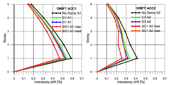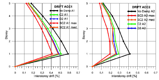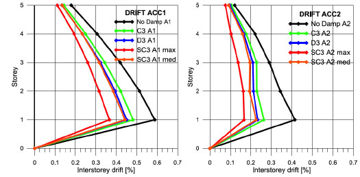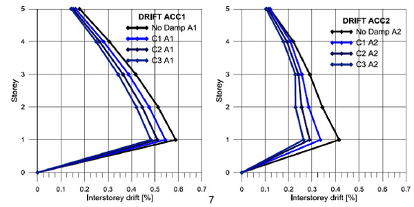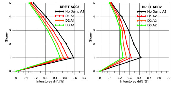 In Fig. (9) the variation of the interstorey drifts varying the external damping is shown. It is proved that doubling and tripling the external dissipation then amplitude of the response reduces respectively less than two times and three times. Namely, as above remembered, the increase of the external dissipation is progressively less effective and this suggest to limit external damping to 20%.