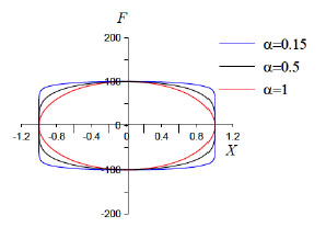 In Eq (1) α is a constant, whose values are generally in the range 0.15-1.95 and depends on the shape of the piston head; for civil applications it seems better that is not greater than 1. In theory with the same maximum displacement and maximum damper force it is possible to obtain a more energy dissipation with smaller values of α, as it is possible to deduce by Fig. (3); unfortunately this effect can create difficulty to the structure members because of the higher damper forces when the structure restoring forces are maximum.