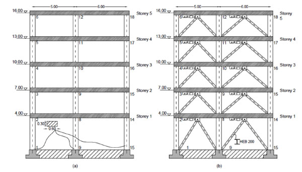 Two dimensional, five story moment frame r.c. structure is defined by rectangular cross section and infinity rigid storey. Diaphragm constraints were assigned at each of the five floor levels. The mass representing the weight at each floor level was assigned equal to 50 KN/m. For the damped configuration, steel diagonals were inserted allowing the connection of viscous dampers and floors.