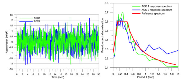 Two accelerograms of 30 seconds having PGA respectively 2.069 and 2.254 m/sec2 were used. These accelerograms resulted compatible with the code spectrum having the following characteristics: