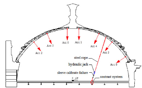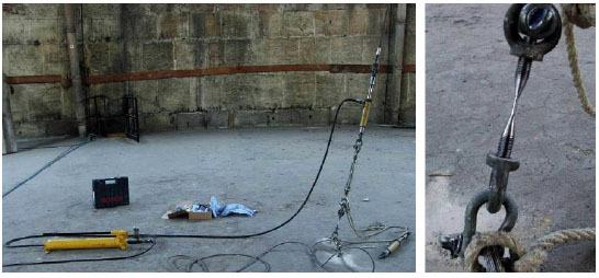 In order to perform the impulsive type tests, a steel wire rope has been passed around the arch in correspondence of the highest point of the dome and was bound to the floor using as a contrast one of the large steel beams that support the floor itself. Between the rope and the system of contrast were placed a hydraulic jack ENERPAC BRC 46, and a sleeve calibrated failure (Fig. 10). To simulate the impulsive load, the rope was stretched by means of the hydraulic jack. Increasing the pull on the rope, when the expected value of sleeve failure has been reached, the sudden breaking of the sleeve itself forces the structure of the dome to an impulse load at the point in which the steel rope was tied to the arch.