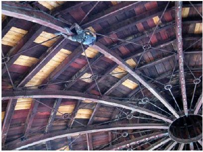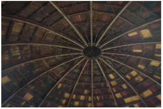 Fig. (4) reproduces the view of the dome as it appears to an observer in the room below the roof and accessible from the fourth balcony of the Teatro Massimo. From this image it is possible to detect the shape of the arches, the arrangement of the braces, wood purlins and plank.