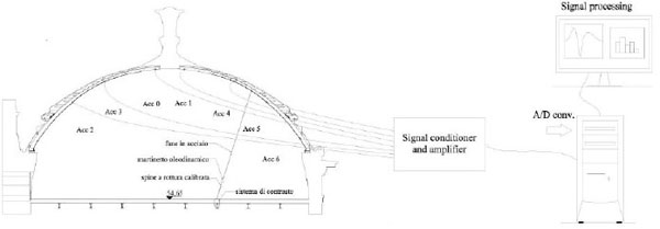 In particular, seven accelerometers, numbered from zero to six, (as reported in Fig. (12)), in which an arrow indicates the positive direction), were screwed on a special plate of plastic material bonded on the surface of the intrados of the arch. In this regard it is important to emphasize that given the majesty and the configuration of the structure of the dome, place the accelerometer was not a simple task, but we have used the assistance of a professional rock climber Giuseppe Di Benedetto see Fig. (13) that here we thank firmly. For each test structural response was acquired by all sensors for a period of at least 120 seconds from the start of the impulse test with a sampling frequency of 1000 points per second.