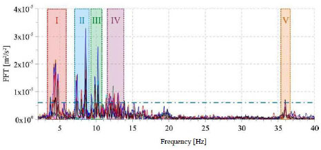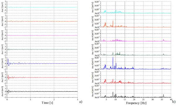 Fig. (15a) shows the time histories of the recorded signals in terms of acceleration. Fig. (15b) represents the analysis in frequency domain through a Fourier transform of the recorded signals.