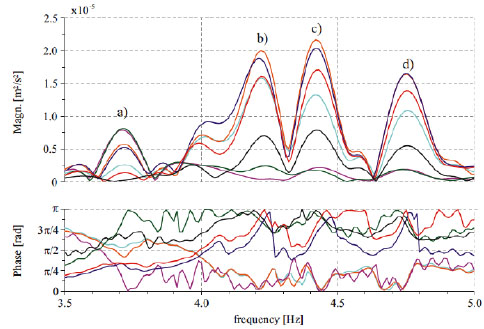 However, for the purposes of this investigation, in the following we will make explicit reference to the frequencies of the first cluster, in which four peaks are well distinguishable, at frequencies 3.71 Hz, 4.25 Hz, 4:46 Hz and 4.74 Hz, respectively.