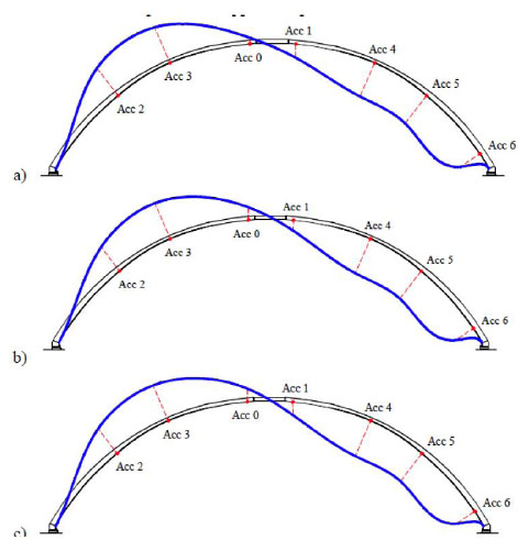 As aforementioned, the structure of the dome is composed of sixteen arches radial symmetry. Because of this symmetry it is chosen to instrument a single pair of diametrically opposed arches, since the tangential displacements can be considered negligible, as confirmed by preliminary results obtained from a model of finite elements calculation (introduced in the next section).