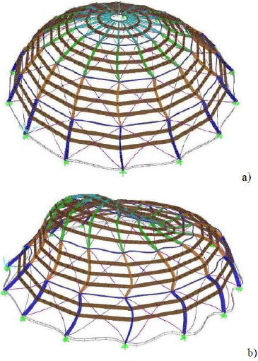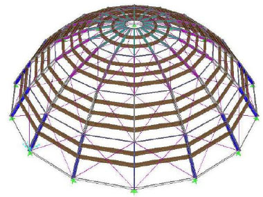 The structure of the dome has been modeled by using 736 1-D “frame” elements, 336 “joint” elements and it has 1750 degrees of freedom, and a perspective view of the Finite Element model of the dome is reported in Fig. (19).