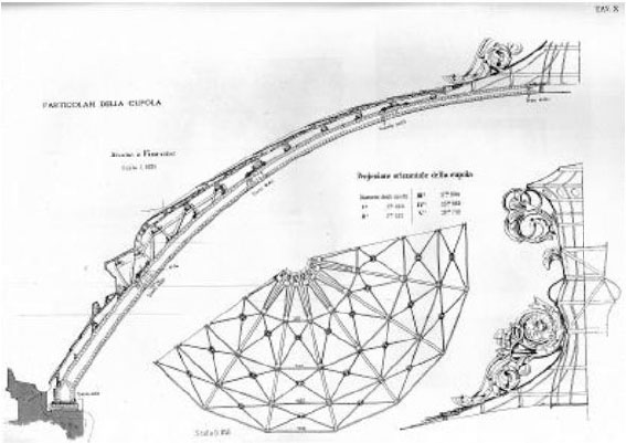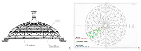 The iron dome of the playhouse is projected in a circle 28.73 m in diameter, covering the audience hall, the space occupied by the loggias. Laying over rollers, for temperature variations, it is composed of sixteen radial arches, five polygonal rings, and one hundred twenty-eight diagonal braces that intersect each, as shown in (Fig. 2).