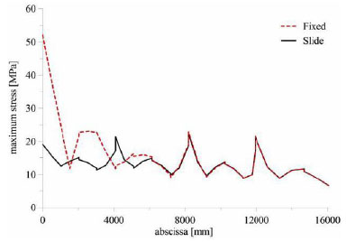 Maximum stress in one of the main arches for fixed support and slide support at the base.