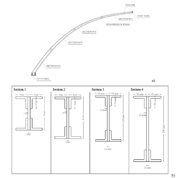 Moreover, the arch is divided into four pieces of variable double T section, the first 152x193mm, 152x243mm the second, the third and finally the fourth 152x295mm 152x390mm Fig. (5), connected to each other in the joints with 12mm thick plates and nails of diameter 15mm. The purlins connecting the arches are made of poplar wood, with section 250x250 mm, connected by angle brackets 78x78x13 mm bolted with screws 18 mm in diameter.