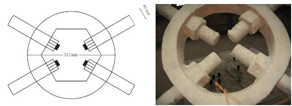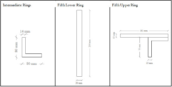 The radial intermediate rings are composed of L profile of size 80x80x14 mm. The upper ring is composed of a flat sheet of size 181x13 mm and an angle of 75x75x13 mm. The lower ring is composed of a profiled plate 250x20 mm. Such rings, whose dimensions are reported in Fig. (6), are connected to the arches through three wings bolted plates with screws of 33 mm diameter. At plates are also bolted diagonal braces of steel round section diameter of 40 mm. As apparent from Fig. (7), these braces are provided of threaded end so as to screw them in a ring of 312 mm diameter in order to perform the stretching of the same rods as well.