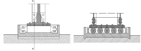 It is worth stressing that in the original design of the structure, the arches rested on five steel rollers perfectly cylindrical and smooth surface with a diameter of 90 mm. The system of the rollers was contained in a iron box. Fig. (8) shows the sections of these support devices. This boundary condition was thought from Basile, to allow displacement of the base of the arches in the radial direction due to changes in temperature or of the vertical loads.