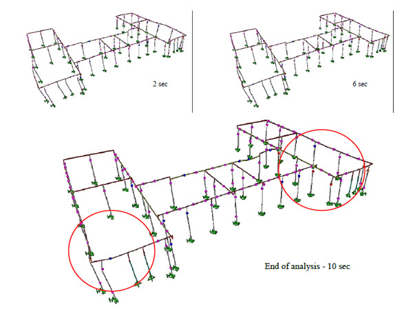 Regarding the damage criteria described in §2.2, the analyses have shown that the ‘upper bound’ condition of 20% pier failures (λ=0.2) is not always reached, even when high accelerations are applied (this is even more the case with the 40% failure criterion). This is due to the fact that substantial damage is localized in specific regions, leaving the rest of the elements nearly intact. In Fig. (10), an indicative damage sequence during inelastic dynamic analysis for the unstrengthened building model is depicted (PGA = 0.6 g). It is clearly seen that the plastic hinges reaching collapse (DS4; red dots) are localized in the front corner piers of the structure.