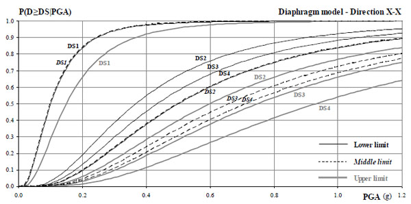 Based on the median values and Eq. 2, fragility curves for the four damage levels (DS1-DS4) were drawn for all cases studied; the sets for the pristine (original) and the rigid diaphragm building models are depicted in Figs. (11, 12) (limits refer to the system in series criterion and the two global criteria, λ=0.1 and λ=0.2, ‘lower’, ‘middle’ and ‘upper’, respectively). The curve set for the case of the reinforced concrete band is very similar to that shown in Fig. (11) for the original building.