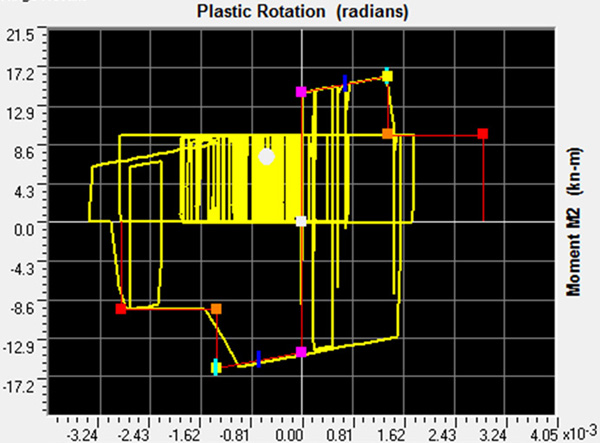 In the absence of a more refined hysteresis model in the available software, elastoplastic kinematic behaviour is assumed under seismic loading, for both piers and spandrels; clearly, pinched behaviour and cyclic or ‘within-cycle’ strength degradation, would have been more appropriate, for both flexure/rocking and shear. As shown in Fig. (3), the hysteretic moment vs. plastic rotation model used showed satisfactory performance without numerical instabilities, even in members entering deep into the post-peak (strength degradation range).