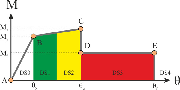 Local criterion (member level): Damage states are defined as shown in Fig. (4), with reference to specific points of the M-θ backbone curve; DS1 initiates at the ‘yield point’ (which, in the case of piers, is defined from the bilinearization of the actual M-θ curve, hence in general corresponds to a stage subsequent to first cracking in the member); DS3 initiates at the exceedance of the θu value defined on the basis of test results (see §2.1), while DS2, in the absence of conclusive evidence in the literature, is simply taken halfway between points B and C; finally, DS4 initiates at the end of the M-θ constitutive law, e.g. at θf = 2θu in the usual case that the critical response is in the loading direction (note that records are applied separately in each direction, to have a clear picture of the response).
