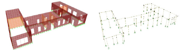 With regard to the model, as discussed in the previous section, the clearly preferred choice in the case of 3D analysis of entire URM buildings is the equivalent frame model. Fig. (1) shows such a model for the typical substructure found in URM buildings, a wall with openings for doors and windows; thicker lines in the model represent the rigid offsets, while dashed lines correspond to piers and spandrels, both of them modelled using beam-column elements.