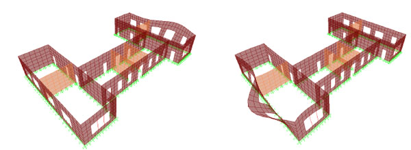 In the absence of a predominant mode in the direction of the analysis (leaving aside for the time being the issue of simultaneous application of earthquake actions in both principal directions) one can in principle, apply modal pushover analysis [10]; this means that the number of independent pushover analyses to be carried out in each direction is dictated by the number of modes that contribute up to a substantial fraction of the total mass (around 80%). Unfortunately, unlike what happens in reinforced concrete buildings and bridges wherein 2-3 modes are typically sufficient for capturing the horizontal response, in 3D URM buildings without rigid diaphragms even 20 or 30 modes might not be enough for activating a substantial part of the building mass, since the modes are of a local nature. Moreover, the location of critical deformations is generally different in each mode, which means that resistance curves (also called pushover curves) have not only to be drawn with respect to different monitoring points (this is also the case with bridges [11]) but, if they are plotted in terms of the total base shear (as commonly done) they might not even have a physically sound shape (i.e. one without snap backs). Finally, results from all these separate analyses have to be statistically combined (e.g. SRSS), which gives rise to a number of problems and inconsistencies, especially in the case of member forces (e.g. pier shears). On top of the theoretical problems, implementation of such a procedure is as yet not ‘automatised’, hence results from different nonlinear analyses have to be combined ‘manually’ (i.e. using a spreadsheet). These problems can be overcome if dynamic response history analysis, which captures the effect of all modes, is used, as described in the following.