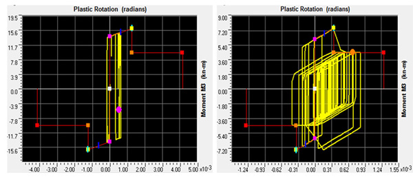 Typical moment vs. plastic rotation response histories for DS1 (left), DS2 damage levels.