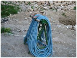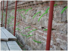 • The holes are then cleaned from loose material and dust and the edges are smoothed. Most of the times the grout is installed using high pressure. The grout passes through the gaps filling the vacuum and squeezing or pushing the air out of the gaps of the masonry. Knowledge of the internal structure of the wall and the percentage of gaps is an element of concern for choosing the most appropriate grout mix. Grouting is performed using rubber tubes with diameters ranging from 0.3 - 0.6m (Fig. 17) depending on the amount of grout