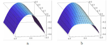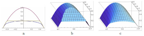 Smoothing of the folded stress function of Fig. (11). Sections of the folded surface and its smoothed transformation at x2 = 0: (a); the section of the parabolic cylinder corresponding to the solution of the traction problem is reported for reference. In (b), (c) a 3d view of the folded and smoothed surfaces is shown.