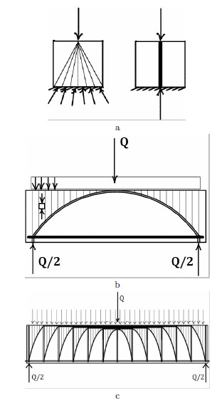 A second simple, but interesting, example is reported in Fig. (13b). The example is concerned with a rectangular panel loaded by a uniform load at the upper base, supported by two vertical forces at two points on the lower base, and representing a concrete beam, reinforced by a lower straight rebar and with no stirrups. In the statically admissible stress field that is depicted in Fig. (13b) the reinforcing steel, simulated as a 1d straight fiber, carries a singular stress, that is a concentrated, uniform, tensile, axial force; the stress field in the concrete consists of of a singular part, represented by a concentrated, compressive, axial force, applied on a curved arch, and a regular part, represented by vertical uniaxial stresses located above the arch.