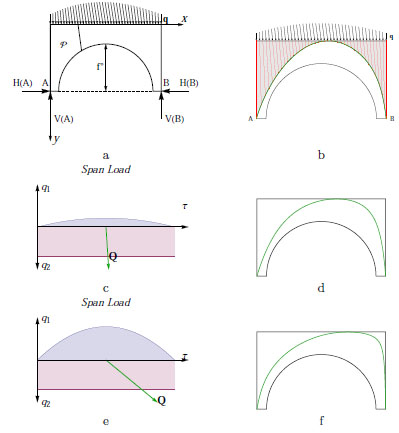 Lintel loaded by vertical and horizontal forces. Geometry of the panel: (a). Forces acting on the panel, compression rays and arch: (b). Horizontal and vertical load for two special cases (c, e) and the corresponding equilibrium solutions (d, f).