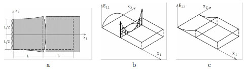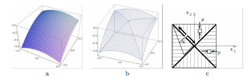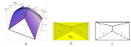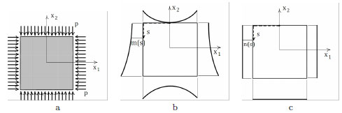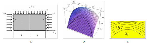 Square panel under uniform pressure. Smooth Airy’s stress function corresponding to a homogeneous pressure inside the body: (a); folded Airy’s function: (b); representation of the uniaxial and singular stress field corresponding to the folded Airy’s function: (c).