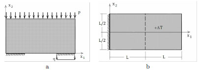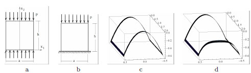The first simple example we consider, is concerned with an elementary problem for which regular stress fields can be derived from the stress function formulation. The example shows the effect that a slight change of boundary conditions, can have on the problem. The two simple BVP depicted in Fig. (9) are considered. The first one (Fig. 9a) refers to a rectangular wall compressed at the two bases by uniform normal tractions. The second example (Fig. 9b) is the same wall compressed at the top base by a uniform pressure load and fixed at the bottom base. By employing the Airy's representation and by using the static and kinematic theorems, it can be shown that in case (a) the load is limit and in the second case the load is safe.