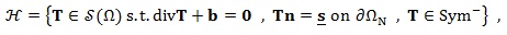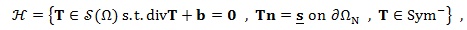 An equilibrated stress field T (that is a stress field T balanced with the prescribed body forces b and the tractions s given on ∂ΩN satisfying the unilateral condition (17) (that is conditions (21)), is said statically admissible for a RNT body. The set of statically admissible stress fields is denoted