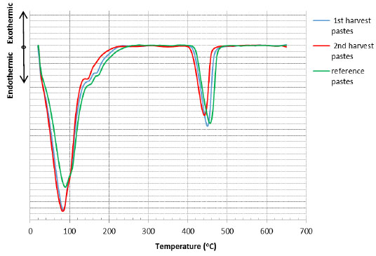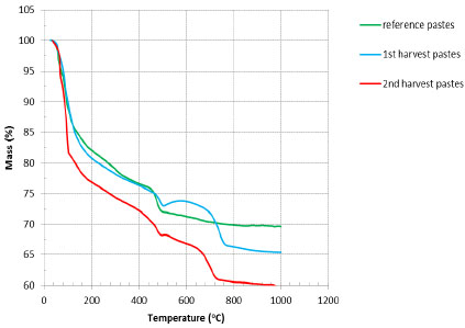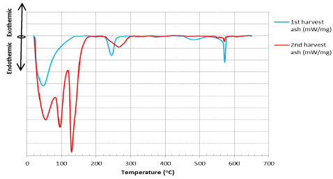 Fig. (2) shows the differential scanning calorimetry of ashes. It is observed that the combustion reactions of residual sugars are endothermic. There are several peaks on the results of the 2nd harvest ash, probably because of the different sugars present in the sample.