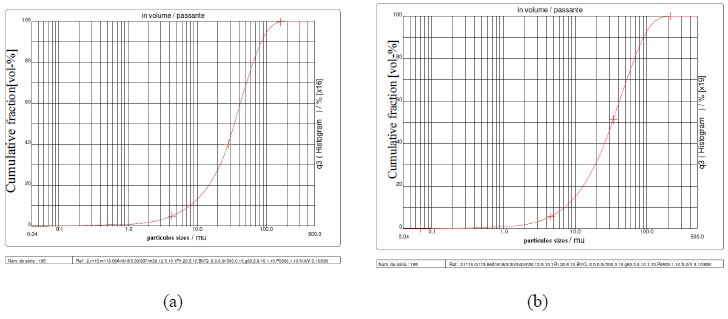 Granulometric curve of ashes 1st (a) and 2nd (b) harvests.