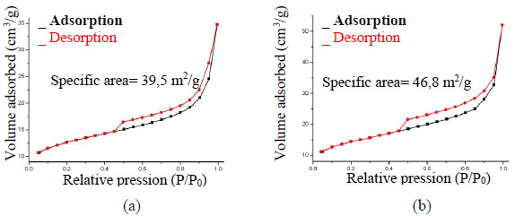 The specific surface results of the ashes are shown in Fig. (4). Each figure presents a variation of volume of nitrogen absorbed and desorbed related to pressure. There is a hysteresis in the range adsorb and desorption curves. These data allow the estimation of the specific surface of the ashes from the 1st and 2nd harvests, being 39.5 and 46.8 m2/g, respectively.