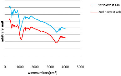 Fig. (5) shows the infrared absorption of the ashes on the spectral range 300-4000 cm-1. Both ashes show well defined bands with the presence of the band 1000 amorphous quartz and quartz crystalline at 3500 band, and the presence of vibration due to carbon-carbon bonds. The presence of quartz in the ashes could be related to the contamination of the soil [22].