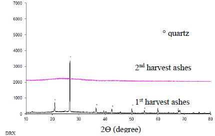 Fig. (6) shows the XRD patterns of the ashes. The data clearly indicate that the ashes of the second harvest present predominantly non-crystalline structure, while the ashes of a first show less amorphicity. Thus, it was not possible to infer which of the samples has a higher content of amorphous silica.