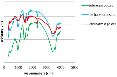 Fourier Transform Infrared spectroscopy (FTIR) of pastes with 90% of the cement and 10% of the in natura ashes 1st and one with 2nd harvest and one without ashes (100% cement).