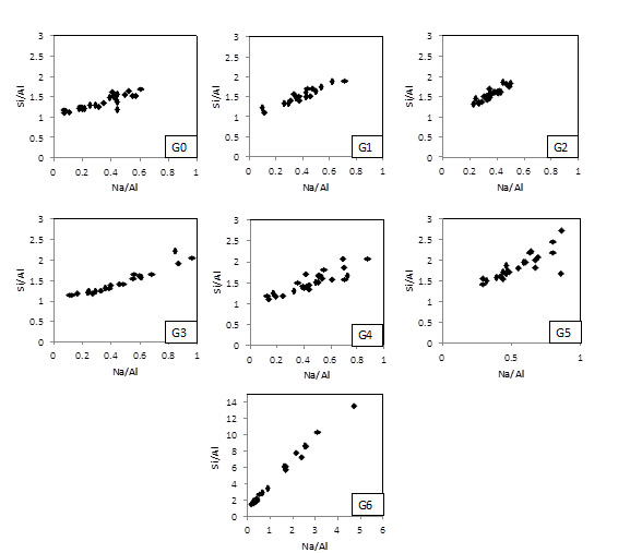 Energy dispersive spectroscopy (EDS) was carried out using a SEM FEI Nova Nano scanning electron microscope. Quantitative analysis for Si, Al and Na was determined in 24 distinctive points of each geopolymer (G0 to G6). The composition of the hardened geopolymer paste is presented in terms of the Si/Al and Na/Al ratios of the matrices.