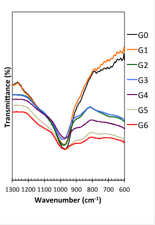 Fig. (11) also shows some changes in the FTIR spectrum between 1300 cm-1 and 600 cm-1 as RHA replaced MK in the geopolymers. Formulation G0 and G1 (containing respectively 0% and 10% RHA) are represented mainly by the sharp band at ~980 cm-1, which becomes weaker as the amount of RHA increases in the mixes. This band is very weak for formulations C6 and C7, indicating that the amount of the geopolymer binding phases has reduced significantly. This explains the soft behavior of those geopolymers, as discussed in section 3.1.