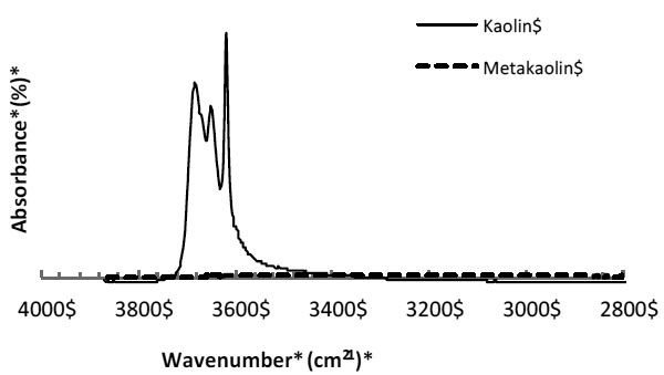 Fourier Transform Infrared (FTIR) of the starting kaolin and MK also showed that the thermal treatment used in this work released the majority of hydroxyl ions, which is associated with the change in the structure of the kaolin and formation of the MK. This is evident with the absence of O-H bands in the region 3700-3500 cm-1 for MK (Fig. 3). FTIR indicated that if kaolinite is present, the percentage is negligible.