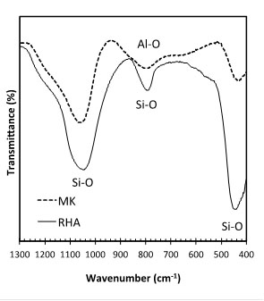 As mentioned before for the raw materials, the bands at ~1080 cm-1 and ~790 cm-1 for RHA (Fig. 5) correspond to the stretching vibration of Si-O bonds and the band at ~460 cm-1 corresponds to the bending vibration of Si-O; they are all typical for amorphous silica in RHA [32, 33]. Similar bands are found for MK: ~1080 cm-1 for the stretching vibration of Si-O and a broader band ~800cm-1 corresponding to the vibration of Si-O-Al [34, 35]. As the geopolymerization reaction proceeds, the bands at ~1080 cm-1and ~800 cm-1drop in intensity (Fig. 11), as they are replaced with a band at ~980 cm1 associated with new geopolymeric phases.