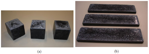 Fig. (6) shows the cubes and prisms of geopolymers prior to testing. The dark color is a consequence of the employment of RHA in the mixes. It is possible to observe the formation of efflorescence at the top surface of the samples due to surface carbonation (formation of sodium carbonate). This is in accordance with the literature [26] and may present limitations on the applicability of geopolymers, especially as a finishing material. Despite the surface carbonation, no surface cracking was observed in any of the geopolymers studied.