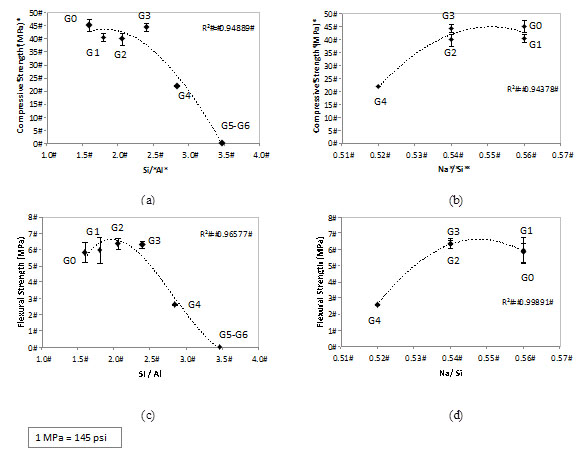 The trend lines in Fig. (6) indicate that the best mechanical behavior is achieved for a system with the following activating parameters: Si/Al ~ 2.0 and Na/Si ~ 0.55. This corresponds a Na/Al between 1.0-1.1 (Table 2). This composition is similar to that proposed by Provis et al. [29] to give optimum compressive strength in MK-based geopolymers.