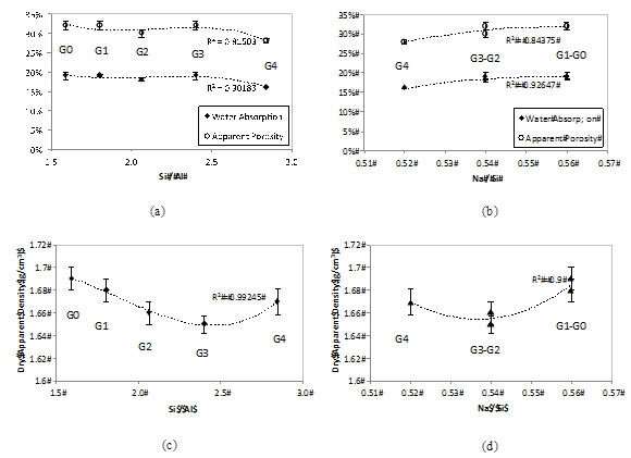 Fig. (8c and 8d) shows the results for apparent dry density. Results are more variable, as shown by the error bars. The mean values, however, show that the apparent density tends to decrease with the RHA addition, as G0 and G1 are denser than the remaining geopolymers. The explanation for that may be the lower specific gravity of the RHA (~2.1), when compared with MK (2.2-2.7). But, in general, (Fig. 8c and 8d) confirm that the activating parameters Si/Al and Na/Si have little effect in the physical properties of the RHA-MK geopolymers studied.