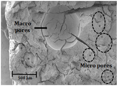 SEM analysis on a fractured surface of formulation G2, Fig. (9) shows that the MK-RHA geopolymers contain both micropores (~10 microns) and macropores (> 500 microns), the latter resulting from air entrapment during mixing. It is likely that the micropores are a consequence of the high water content used, whereas the macropores result from poor compaction of the high viscous mixes. The consequence of the pores is the high water absorption and porosity (Fig. 8a and 8b), which may reduce the durability performance of these materials.