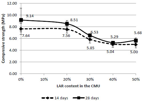 Fig. (10) shows the compressive strength of the MCU produced, as a function of the LAR content. It is possible to observe that the mean strength slightly decreased for 30% LAR content onwards. However, in general, all CMU’s may be classified as structural masonry units, as they all have mean compressive strength above 4.5 MPa and water absorption much lower than 10% (Table 5). One may indirectly assess the pozzolanic behavior of LAR by looking at the difference in strength between 14 and 28 days. In that case, mixes with 40% and 50% do not show any significant increase in strength from 14 to 28 days, which indicates that there was not sufficient PC in those mixes to promote the pozzolanic reaction.